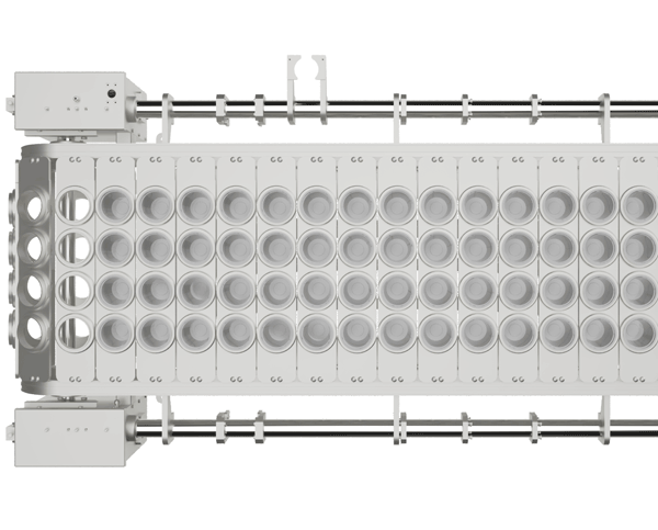 Estación de desinfección de disquetes mediante lámparas UVC o luz pulsada, asegurando la reducción de cualquier carga bacteriana en los disquetes precortados.