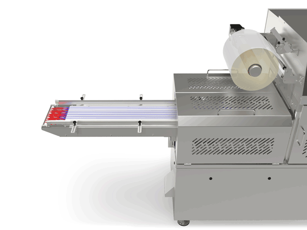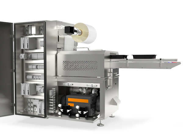 La manipulación de las bandejas dentro de la zona de sellado se realiza mediante mordazas. La unidad es electrónica y está controlada por un inversor, lo que permite una gestión total de los parámetros para manipular una amplia gama de productos, desde sopa hasta carne fresca.