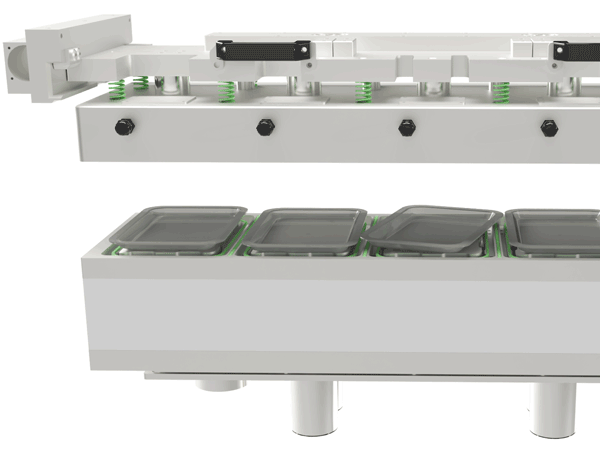 Tecnología que permite una entrada continua de bandejas en la máquina. La cinta transportadora separa automáticamente las bandejas que se transportan, sin detenerse, directas al molde de sellado. Las mordazas se sincronizan electrónicamente con las cintas transportadoras.