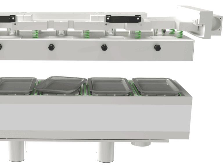 Tecnología que permite una entrada continua de bandejas en la máquina. La cinta transportadora separa automáticamente las bandejas que se transportan, sin detenerse, directas al molde de sellado. Las mordazas se sincronizan electrónicamente con las cintas transportadoras.