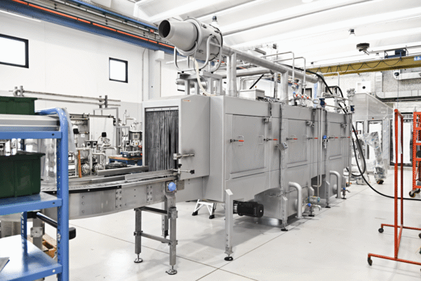 La gama de unidades de lavado externo incluye maquinaria compuesta por distintas secciones, en función de la velocidad de la línea y el tipo de limpieza que se desee realizar. Nuestra máquina más pequeña tiene una práctica longitud de 2 metros, una sección y un carril, y realiza una limpieza sencilla con agua (caliente o recuperada). El siguiente modelo, que puede tener 3 o 4 metros de longitud, está diseñado para realizar un prelavado con agua recuperada, un lavado con solución cáustica para eliminar el código de tinta, y un aclarado final con agua limpia.