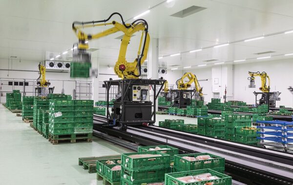 El sistema consiste principalmente en robots antropomórficos con visión integrada y AGV, que manejan el movimiento de los pallets.