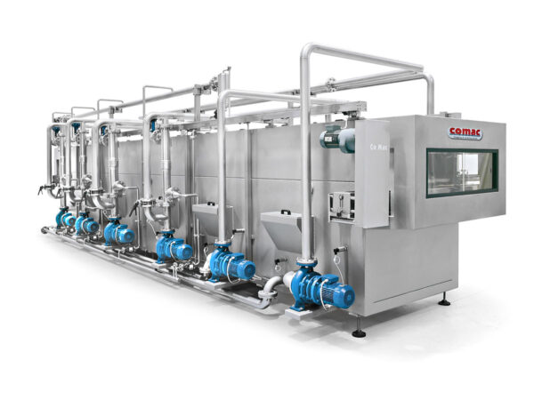 Túneles de pasteurización para productos envasados en botellas y latas. Las botellas o latas llenas se transportan hacia el túnel de pasteurización, donde se someten a duchas de agua con temperaturas cada vez más elevadas hasta que se consigue la pasteurización, con un descenso de la temperatura una vez que se completa el proceso.